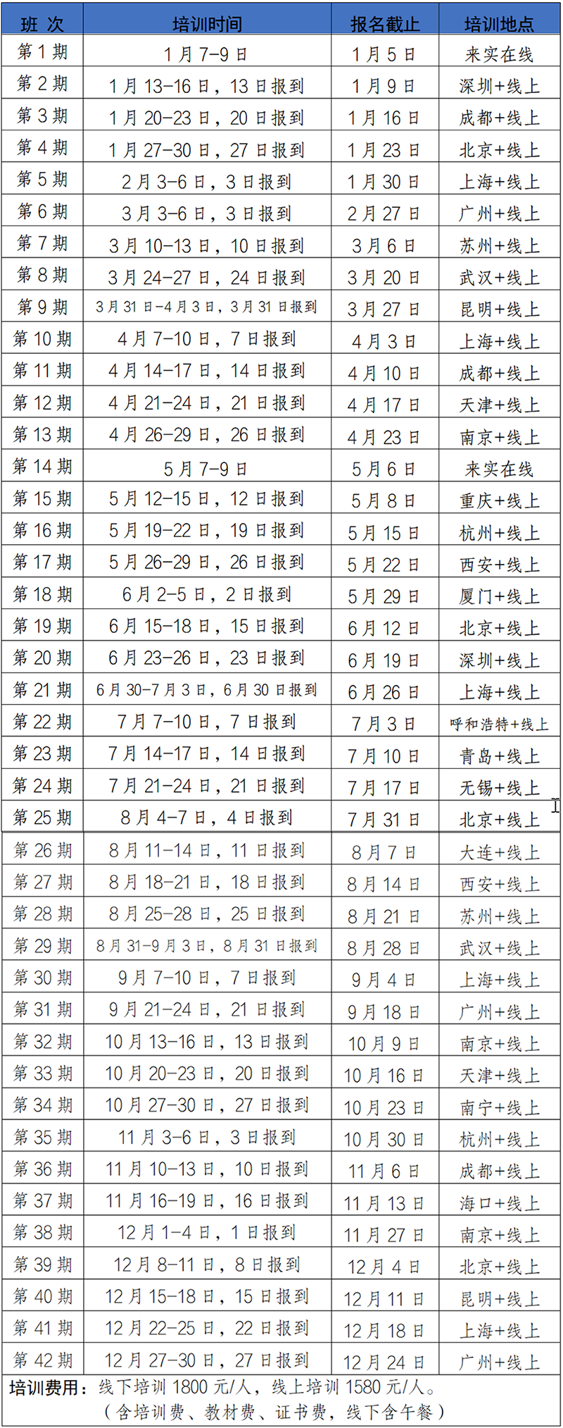 选择通过线上直播培训的学员,本人在年度内可免费参加1期相同课程线下班学习(交通食宿自理,线上班已收到教材和证书的学员,线下班不重复发放)。